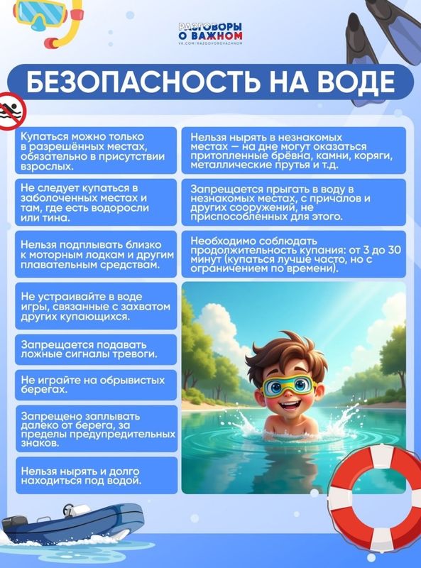 🌊 не допускайте ситуации неоправданного риска, шалости на воде, не прыгайте в воду с лодок, катеров, причалов.